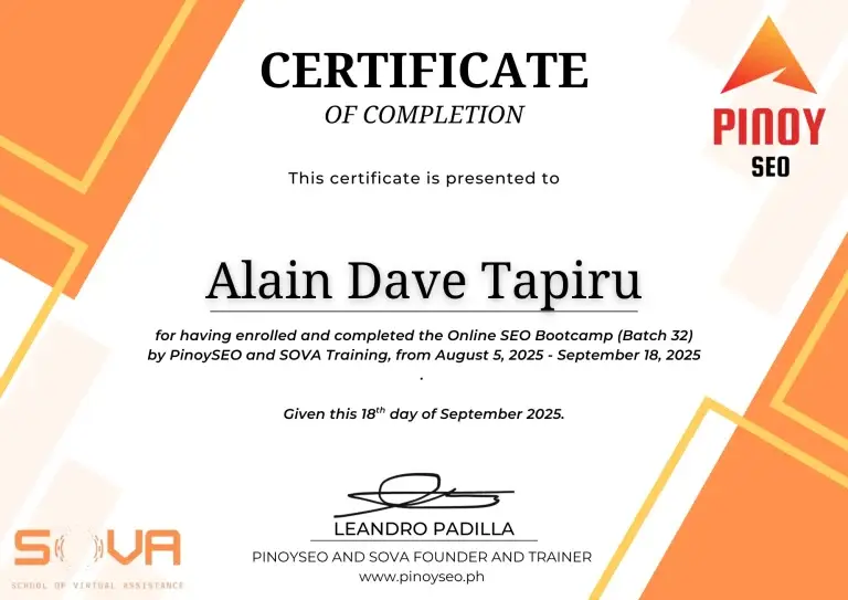 Earlier this year, I completed an online SEO boot camp under one of the top SEO consultants in the Philippines. Since then, I’ve developed a deep passion for search engine optimization and committed myself to mastering the field. My goal is to become a highly skilled SEO specialist, continuously learning, adapting, and applying proven strategies to deliver results.